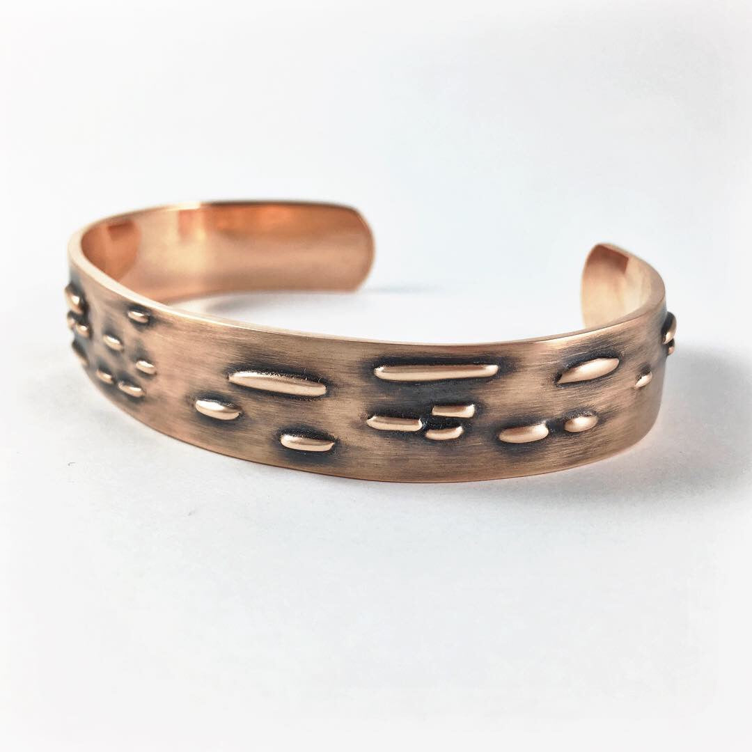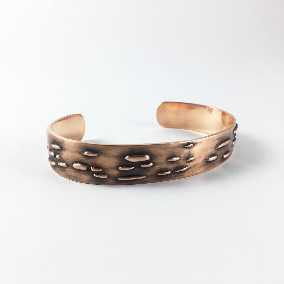 Hand textured and cast in Pink Silver and oxidized to enhance the depth and detail. This cuff is substantial enough for larger wrists, and also looks great on a more delicate arm.