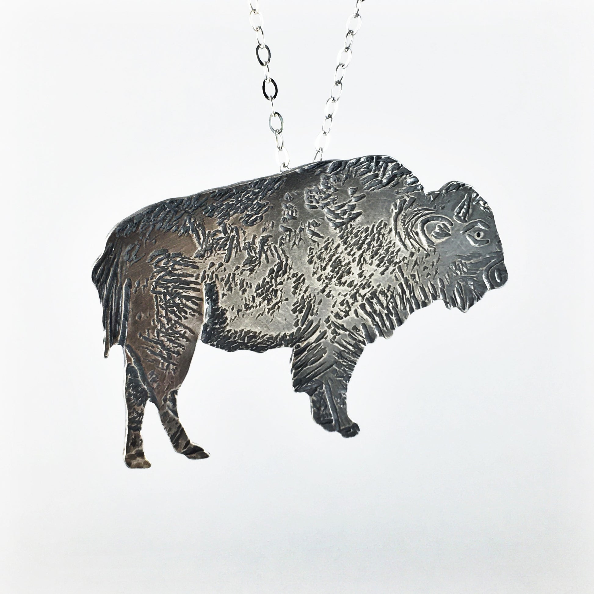 This hand cut bison is textured with various tools to create a realistic creature. It is approximately 1 3/4" long and 1 1/4" tall. Hung on a 18" sterling chain so you can wear it close to your heart as a reminder of Nature's magic.