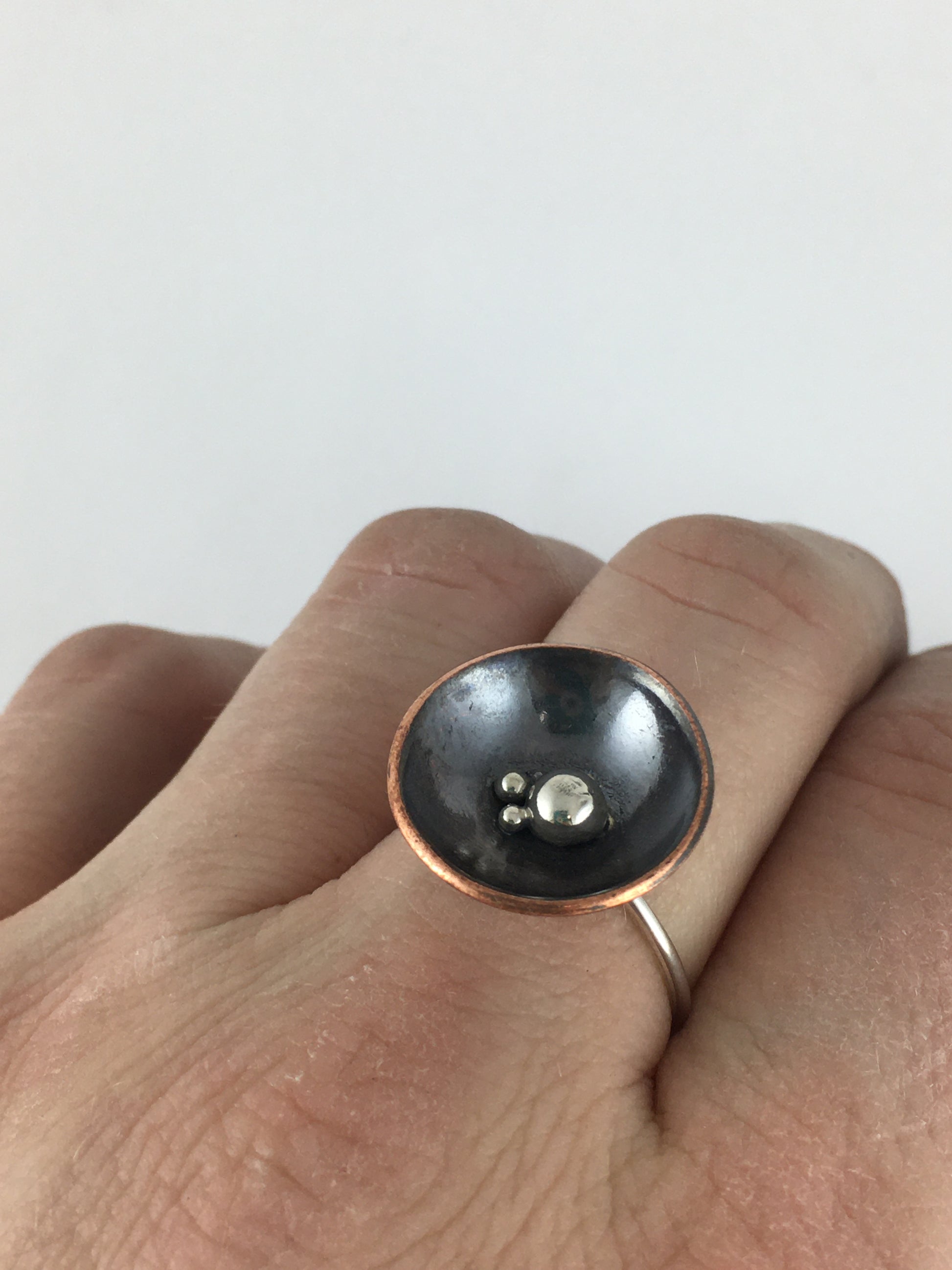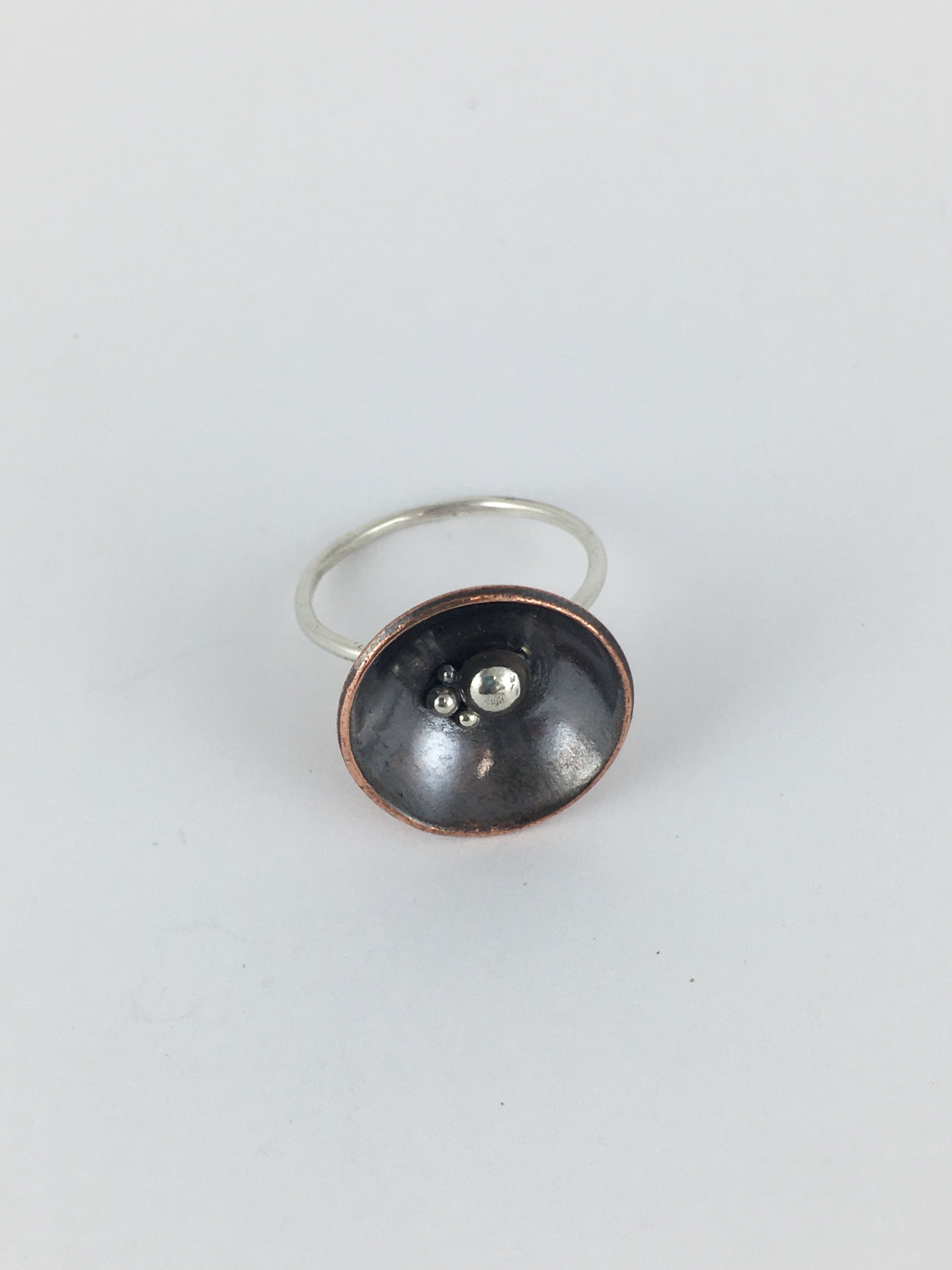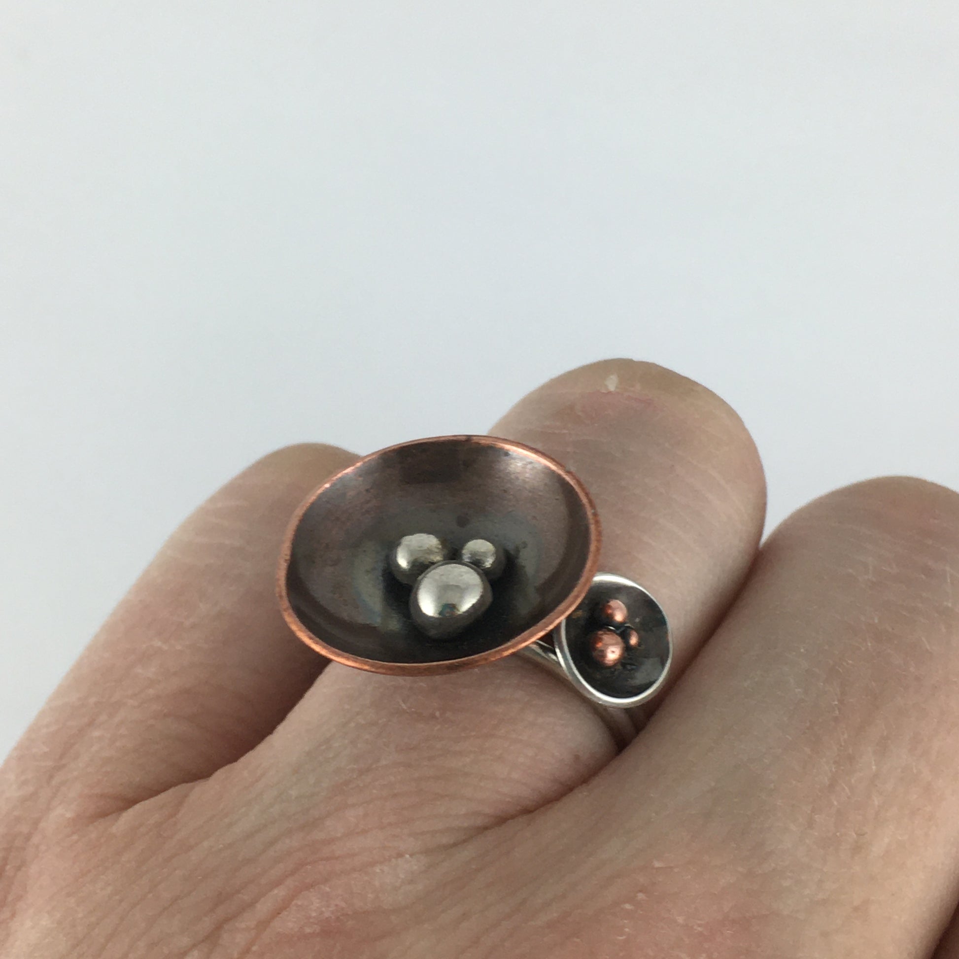 The band is sterling silver with a hand hammered copper bowl holding a cluster of sweet little sterling silver spheres which, like eggs in a nest, are unique for every ring. The copper nest measures about 5/8" in diameter and stands off the band just under 1/4".