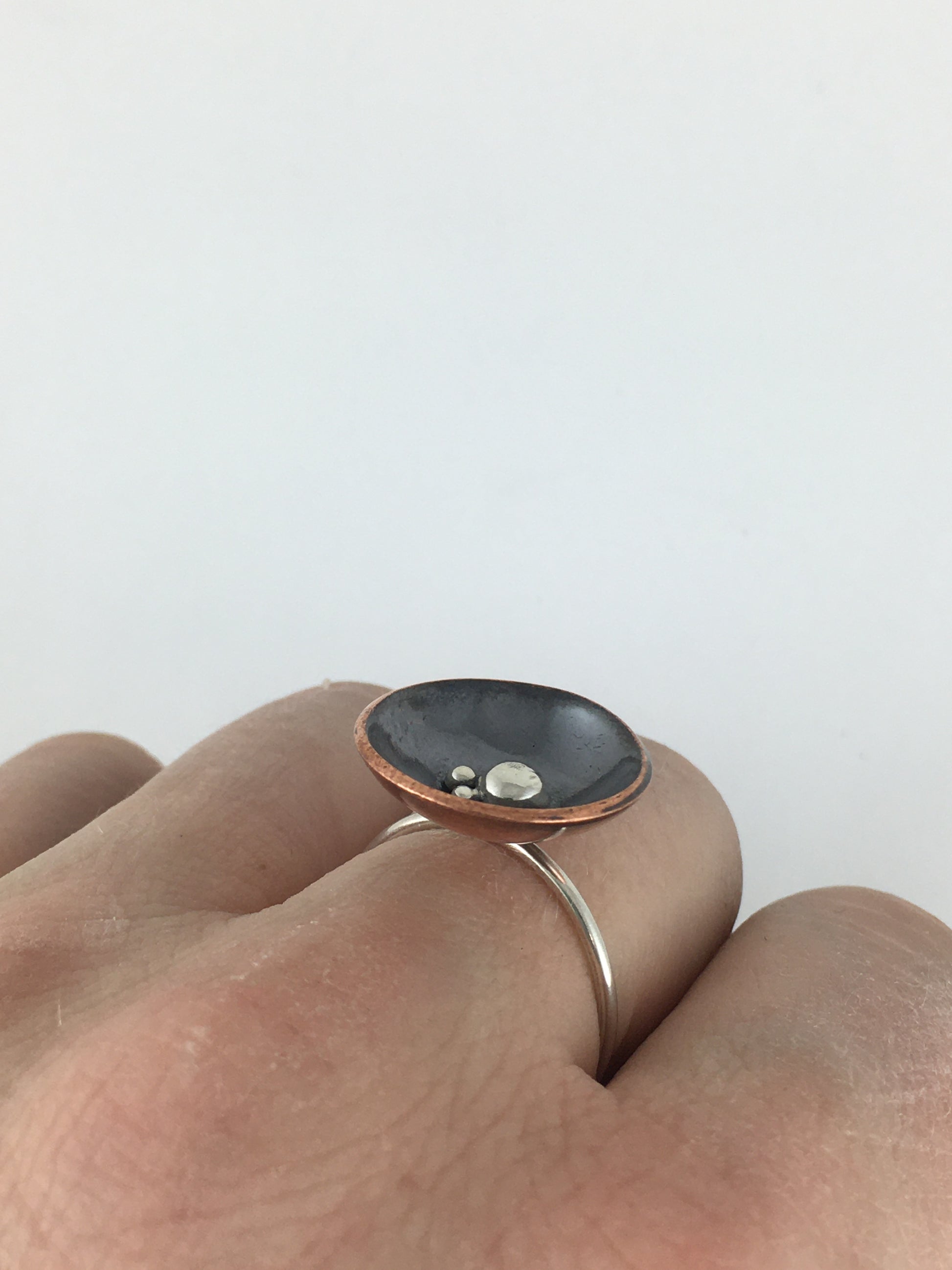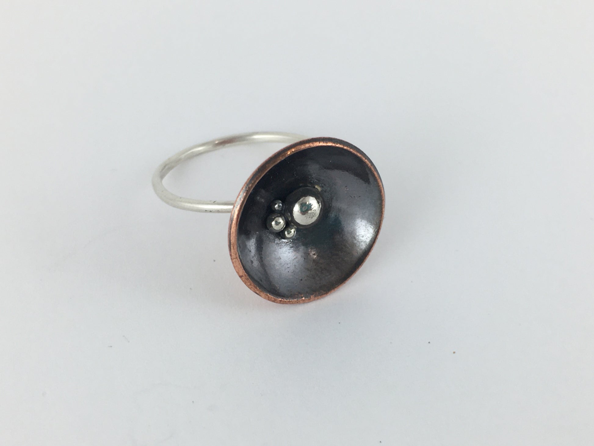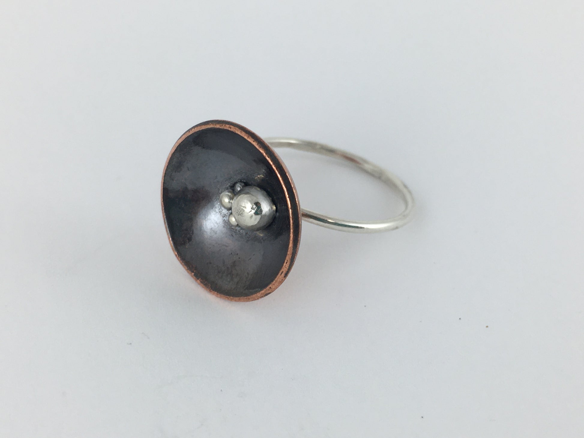 The band is sterling silver with a hand hammered copper bowl holding a cluster of sweet little sterling silver spheres which, like eggs in a nest, are unique for every ring. The copper nest measures about 5/8" in diameter and stands off the band just under 1/4".