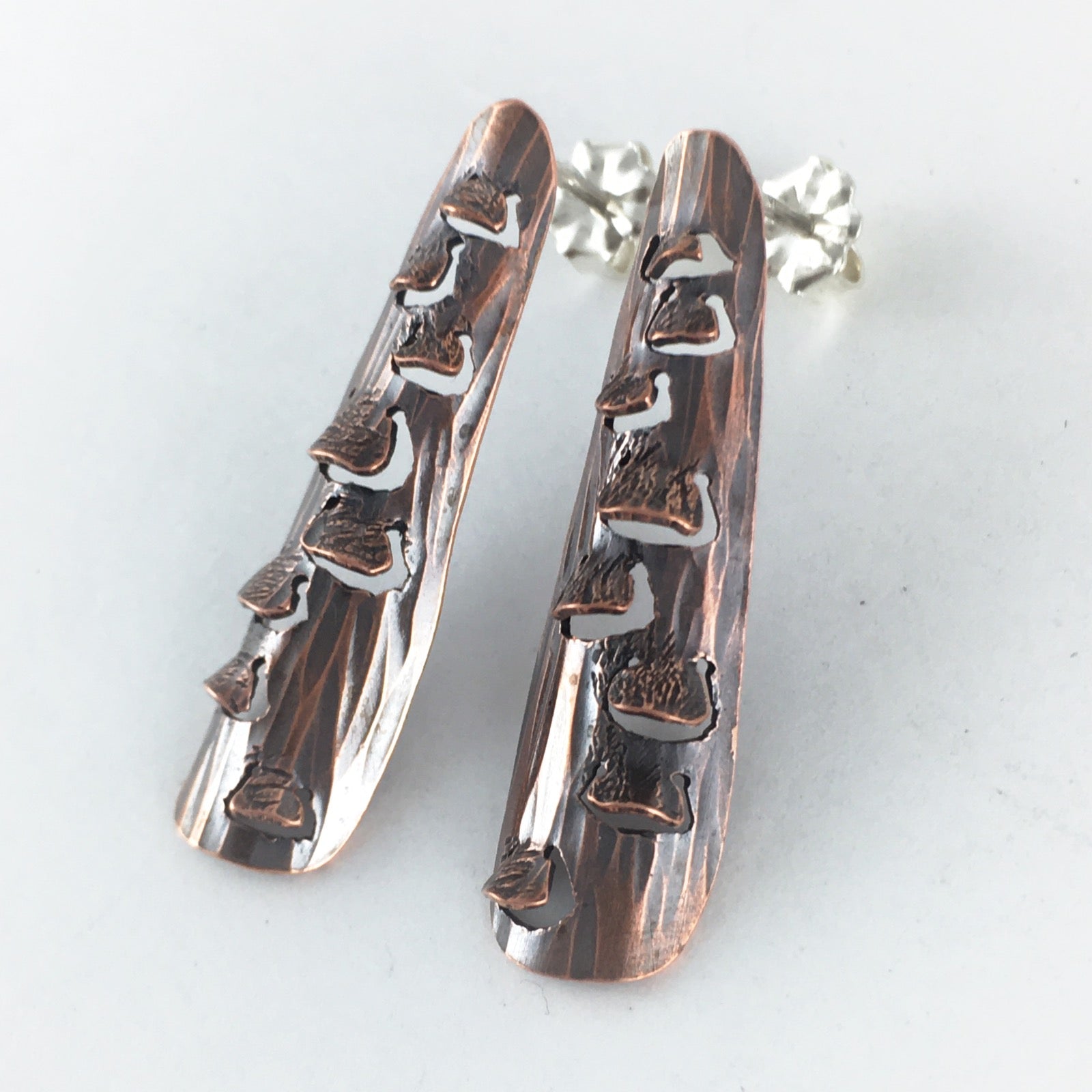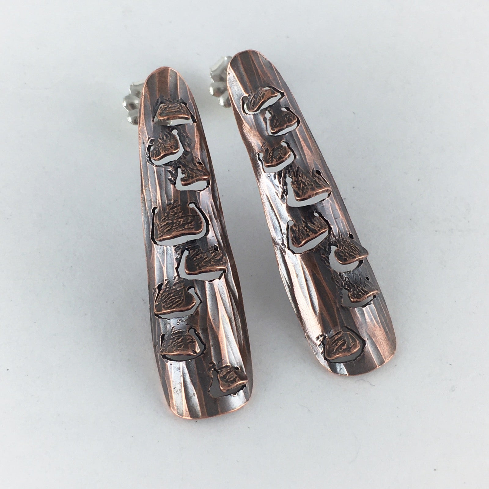Inspired by the shelf mushrooms that line the trees on our forest walks, these earrings are hand fabricated in copper with an antique patina. Made for the nature lover in all of us, they will help you carry the magic of the woods with you wherever you go.