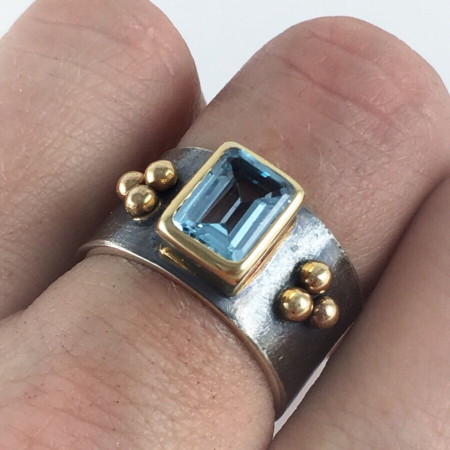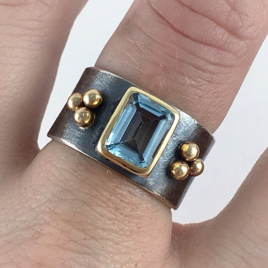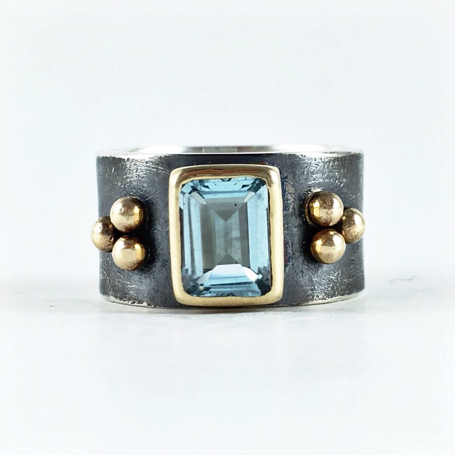 Textured sterling with an antique patina sets off high polish 14 karat yellow gold accents and the bezel that holds the striking sky blue stone.