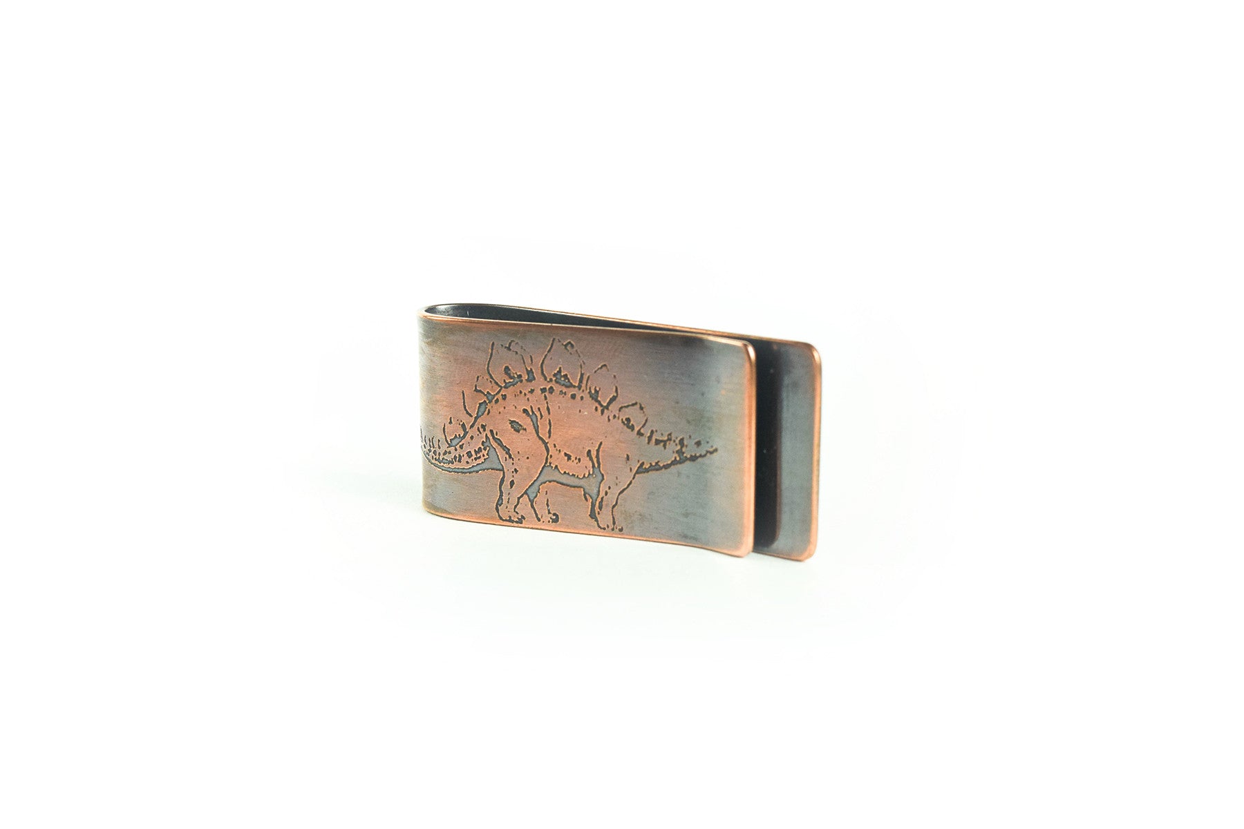 The only money clip you will ever need! Made of pure copper, our money clips are strong enough to hold fat stacks of cash, and your credit cards. Ditch that stuffy old wallet and streamline into the future with this stylish Stegosaurus money clip. He'll keep your money safe and will stay put in your pocket. Who wouldn't want a pocket dino?