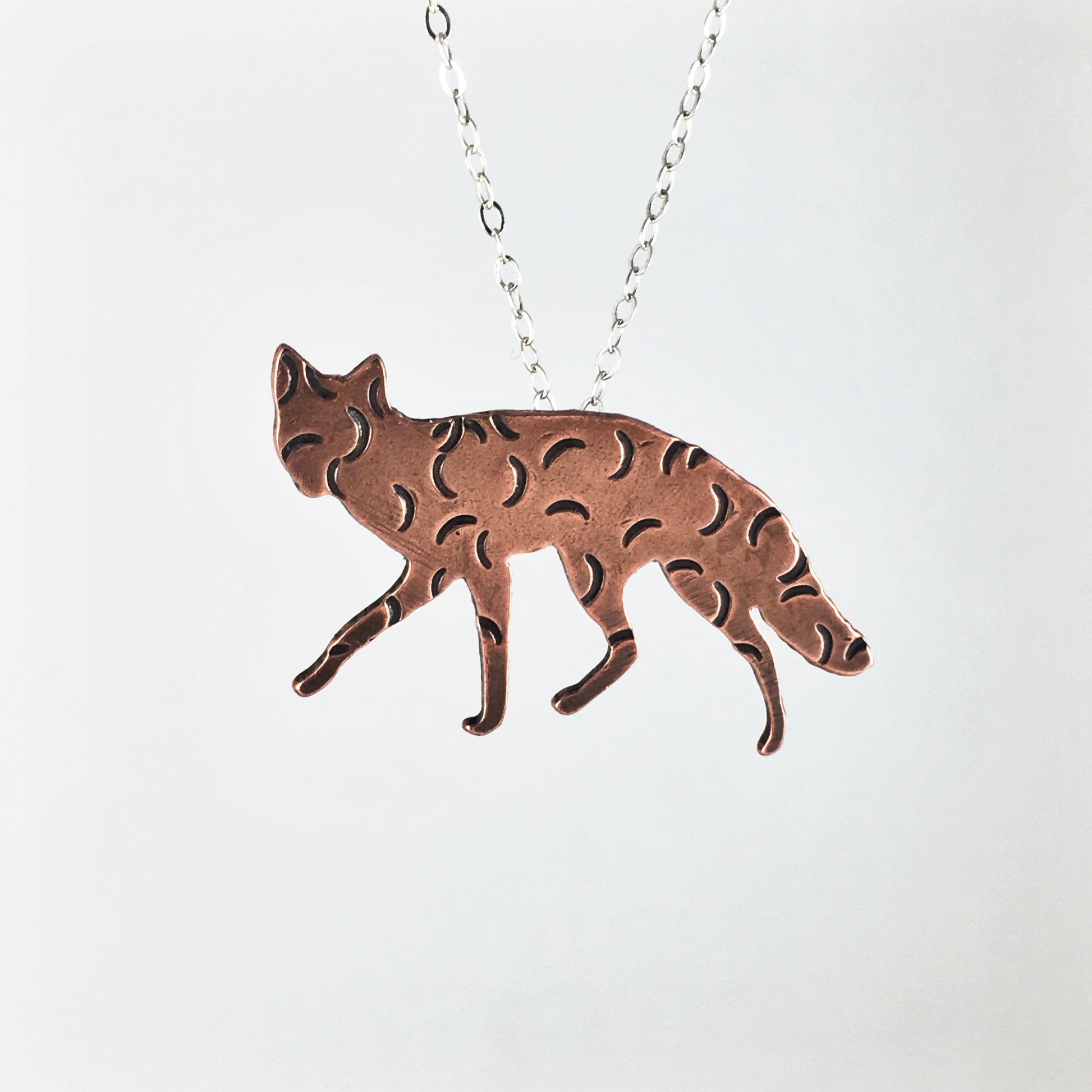 This hand cut fox is textured with a soothing crescent moon pattern and is approximately 1 3/4" long and 7/8" tall from ear to toe. Hung on a 18" sterling chain so you can wear it close to your heart as a reminder of Nature's magic.