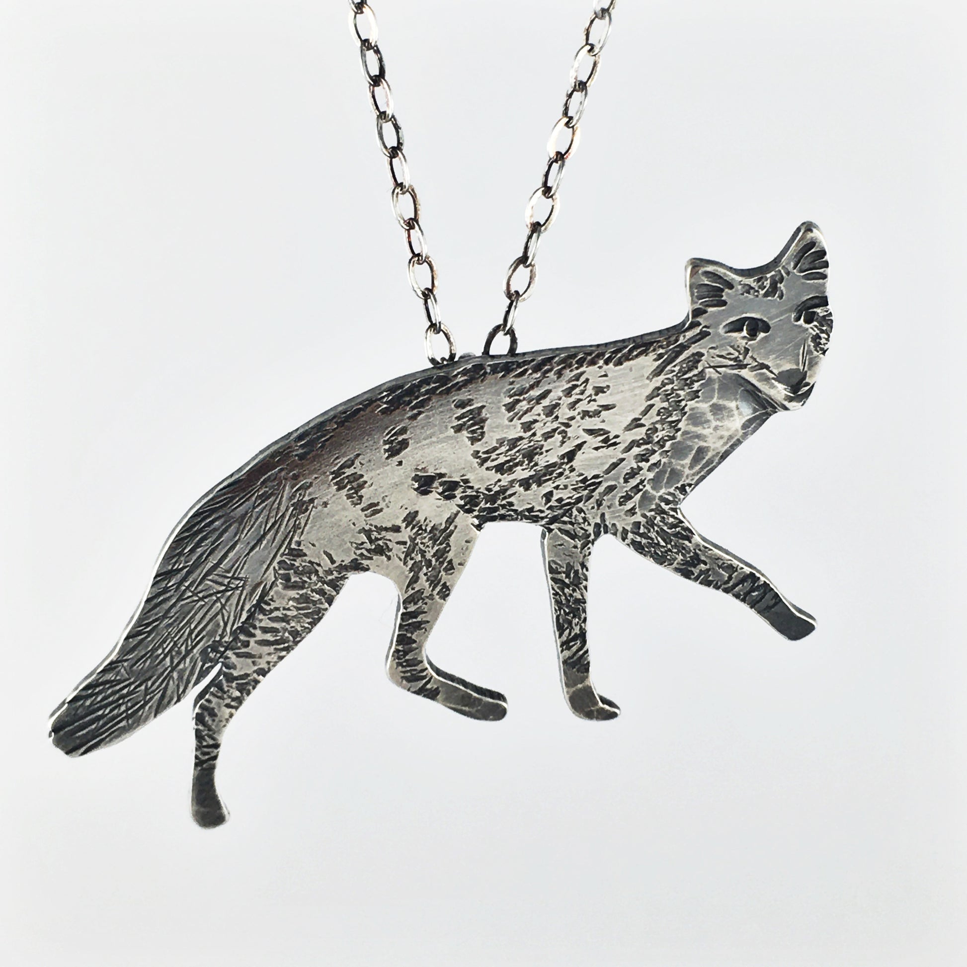 This hand cut fox is textured with with a variety of tools to create a realistic creature. It is approximately 1 3/4" long and 7/8" tall from ear to toe. Hung on a 18" sterling chain so you can wear it close to your heart as a reminder of Nature's magic.