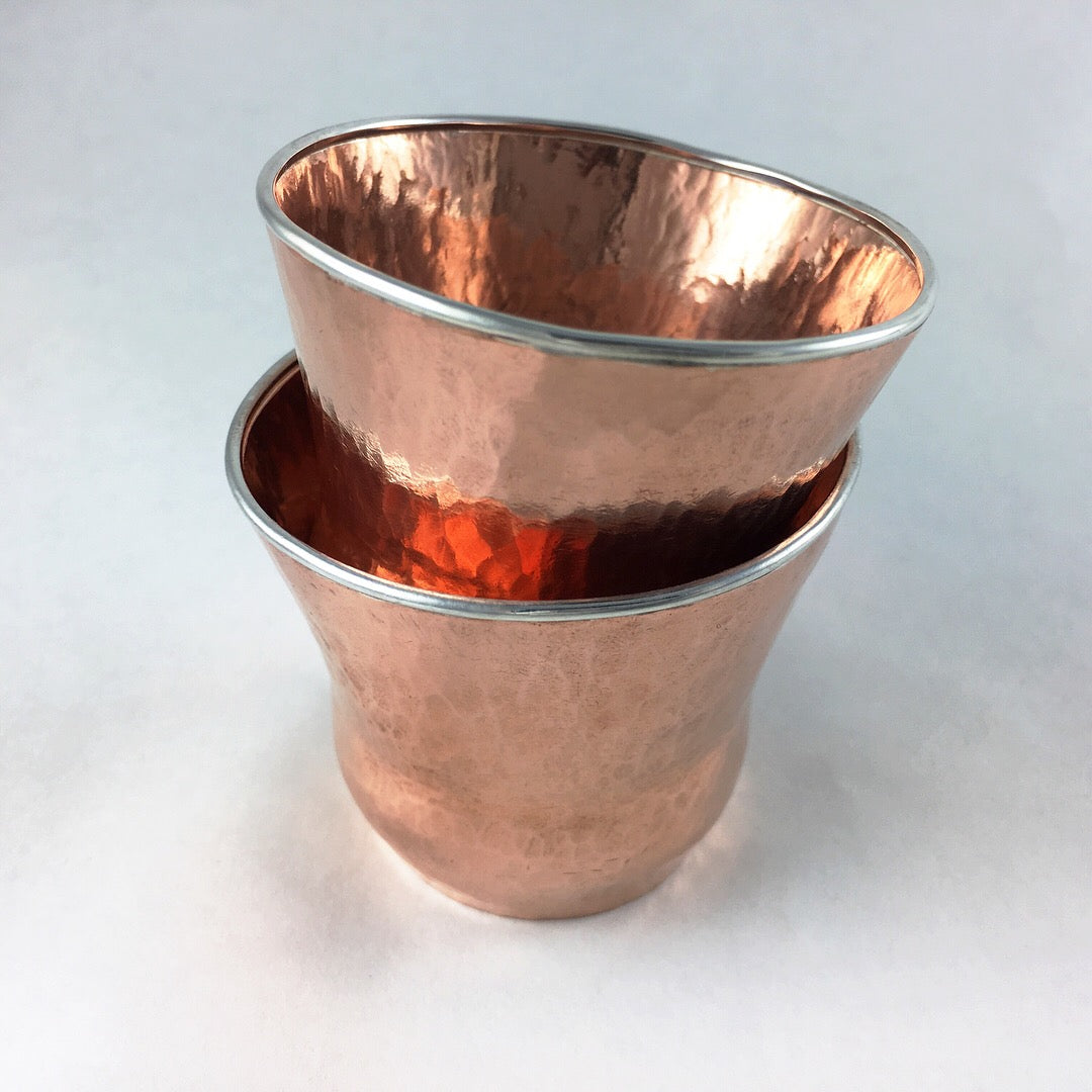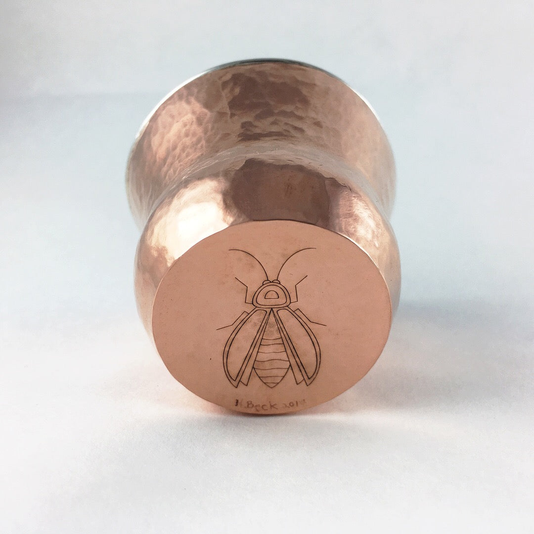 These two-of-a-kind copper vessels were raised by hand from flat sheets of metal in the HBD studio. Rimmed with sterling silver and laser etched with a stylized firefly designed by a close friend, these cups were used in a unique version of a wedding ceremony where the couple invited the special people in their lives to drink to their collective future.