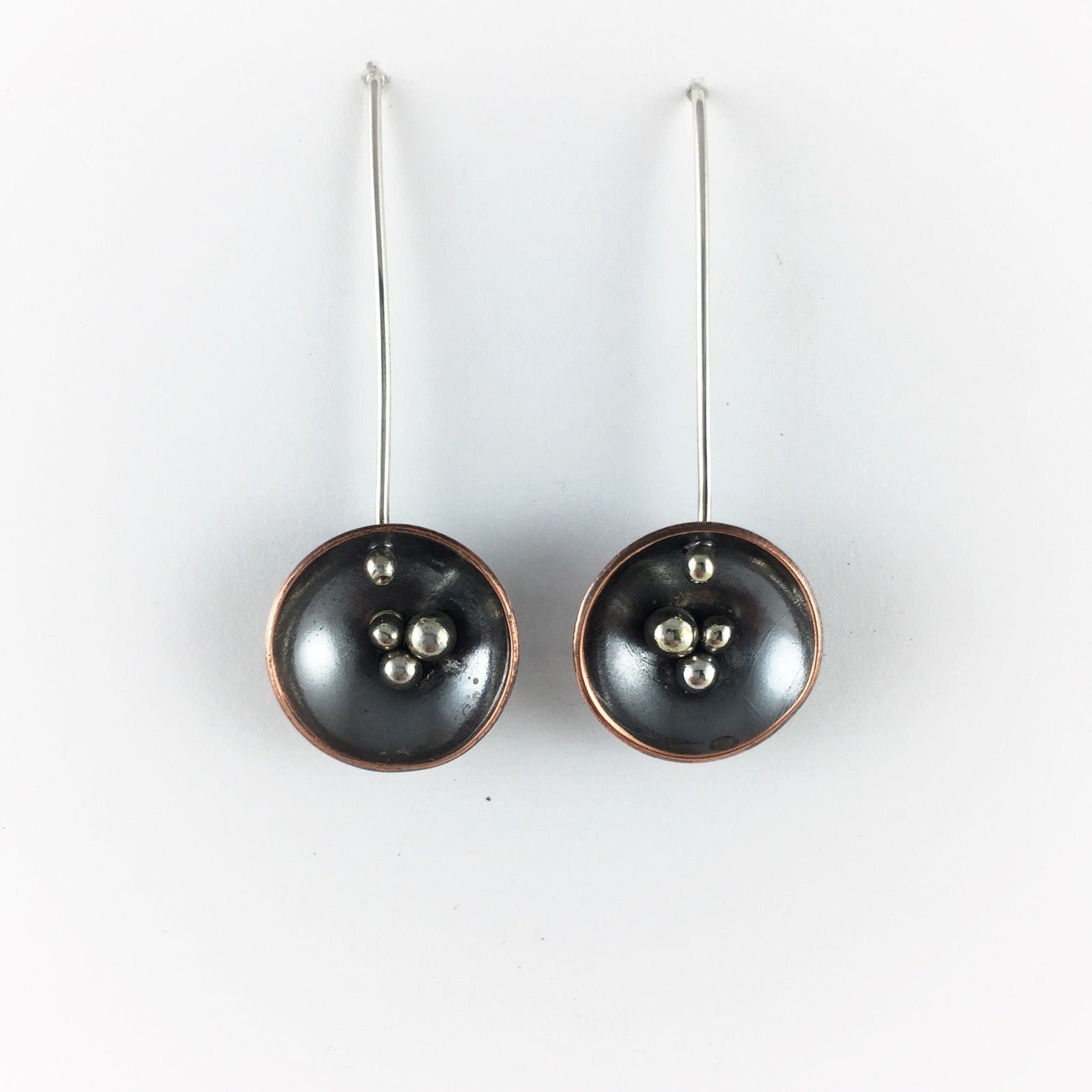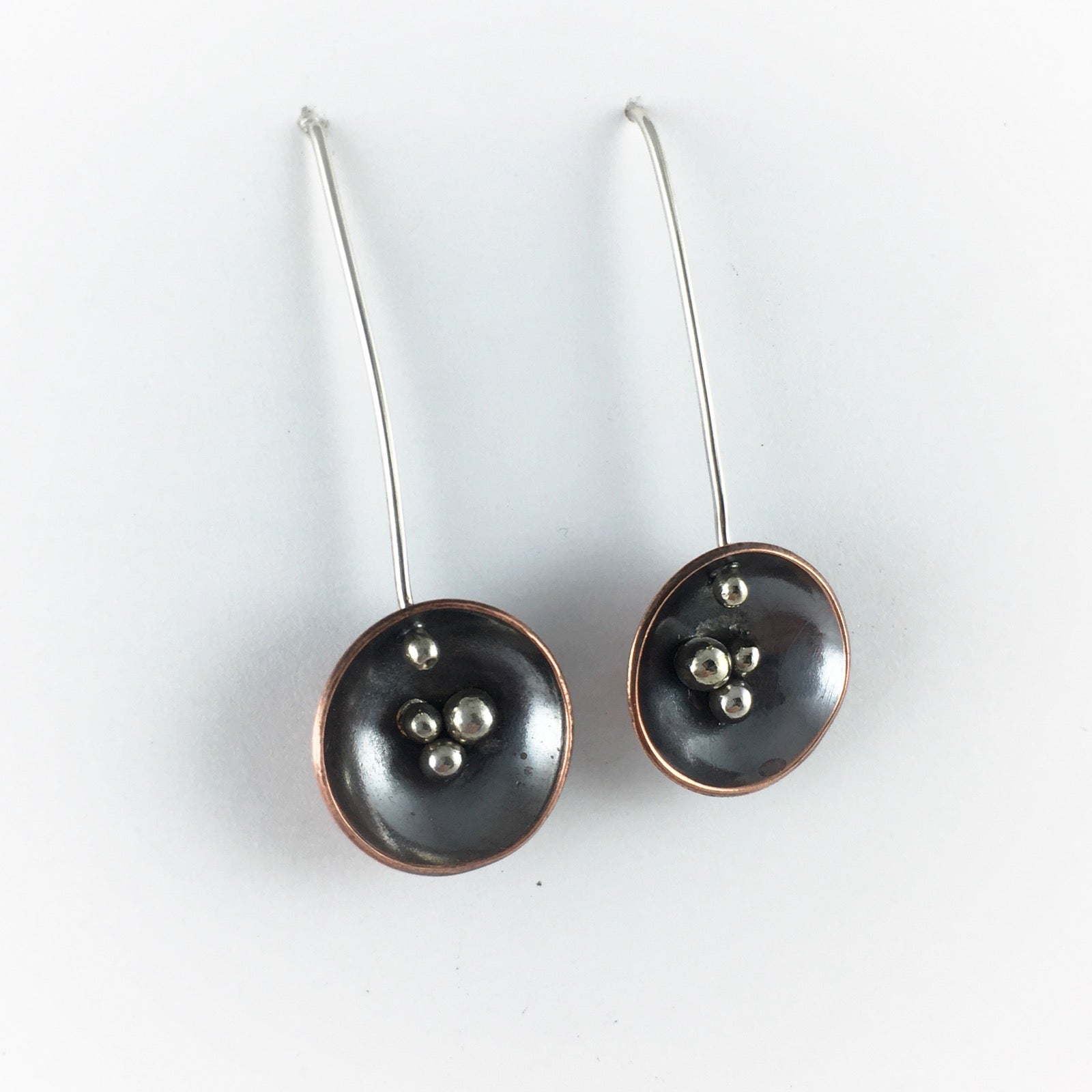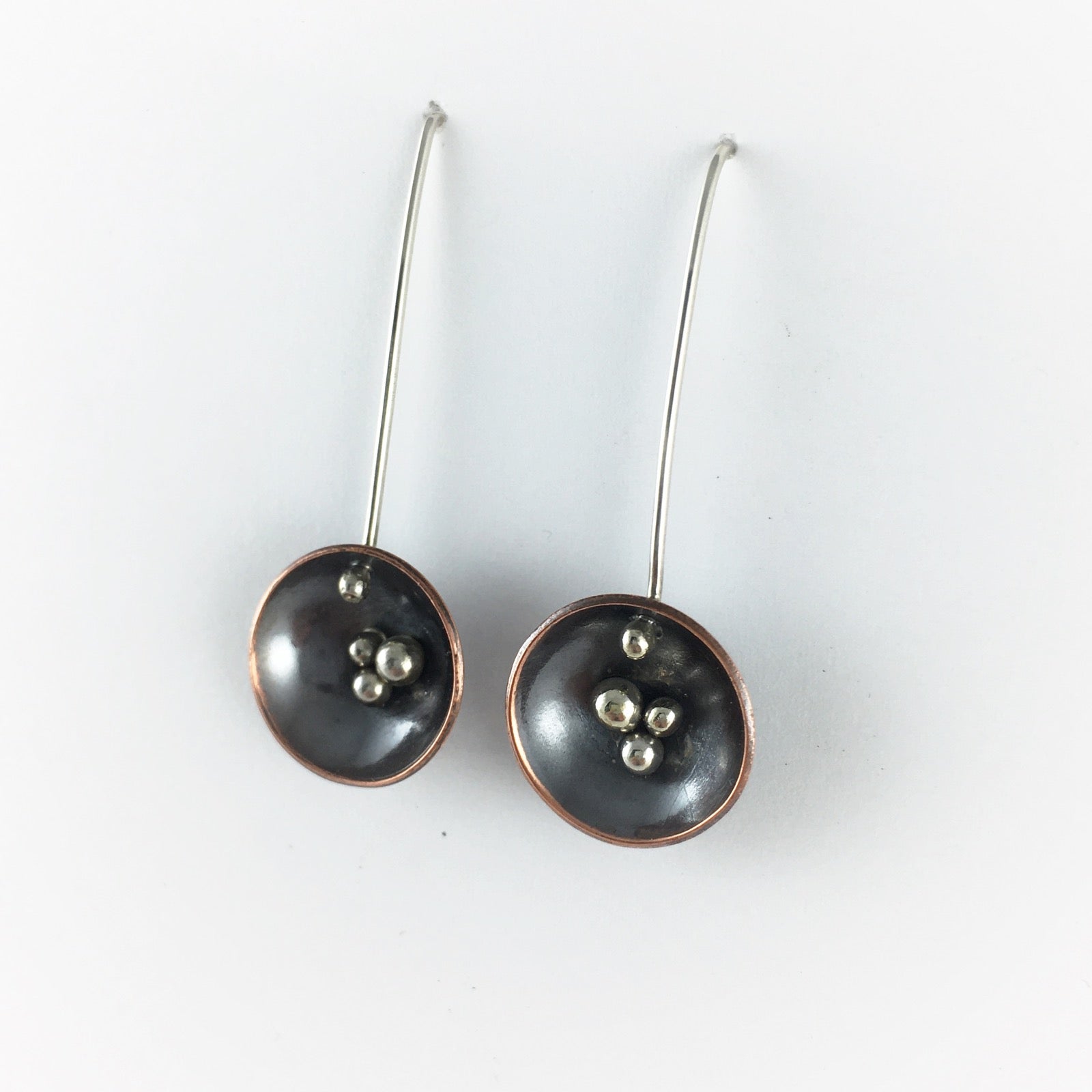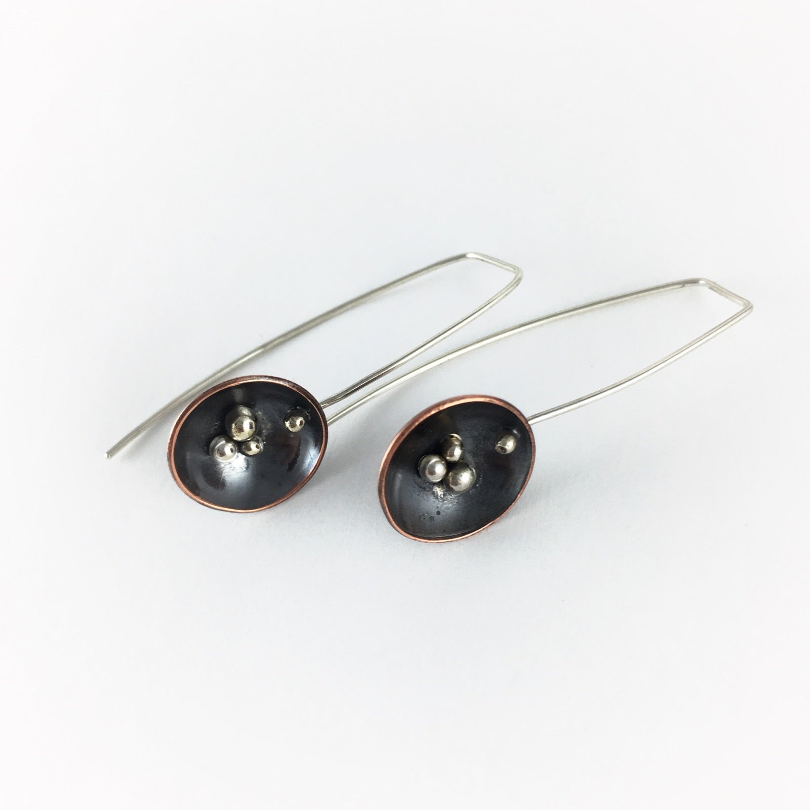 Nest drop earrings, inspired by my time spent in the woods around actual bird nests and bird nest fungi. These earrings are classy, super light-weight, and dangle beautifully. They hang 1.5" from the lobe and have super long ear wires in the back so they stay put even while dancing wildly or adventuring. The nests are hand fabricated, domed and sterling silver granules are soldered into the cup. The cup is 1/2" wide and the back of the sterling ear wire is aprox 2" long. We hope you love them as much as we do!