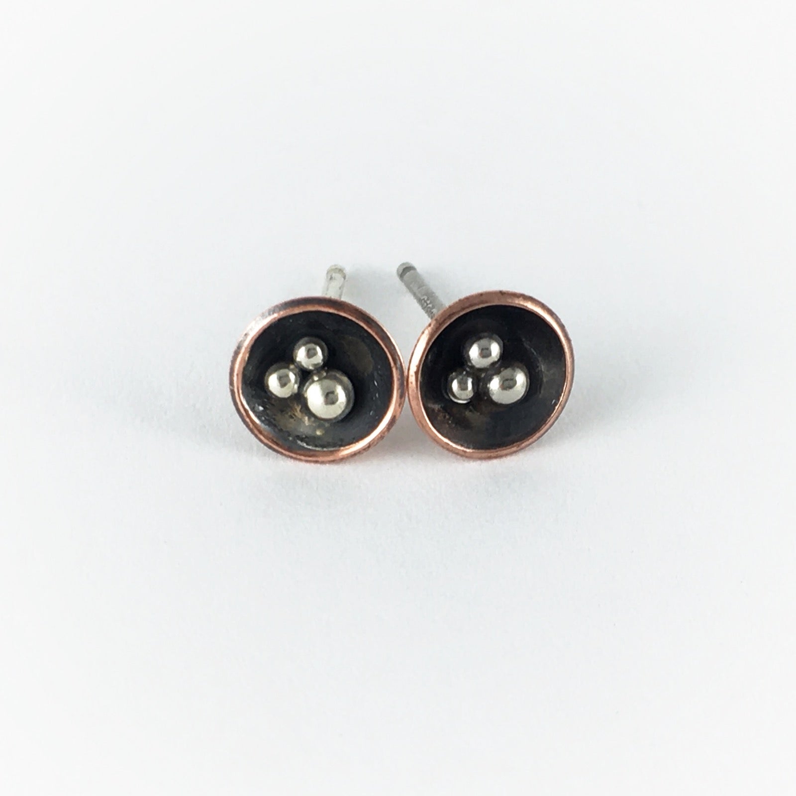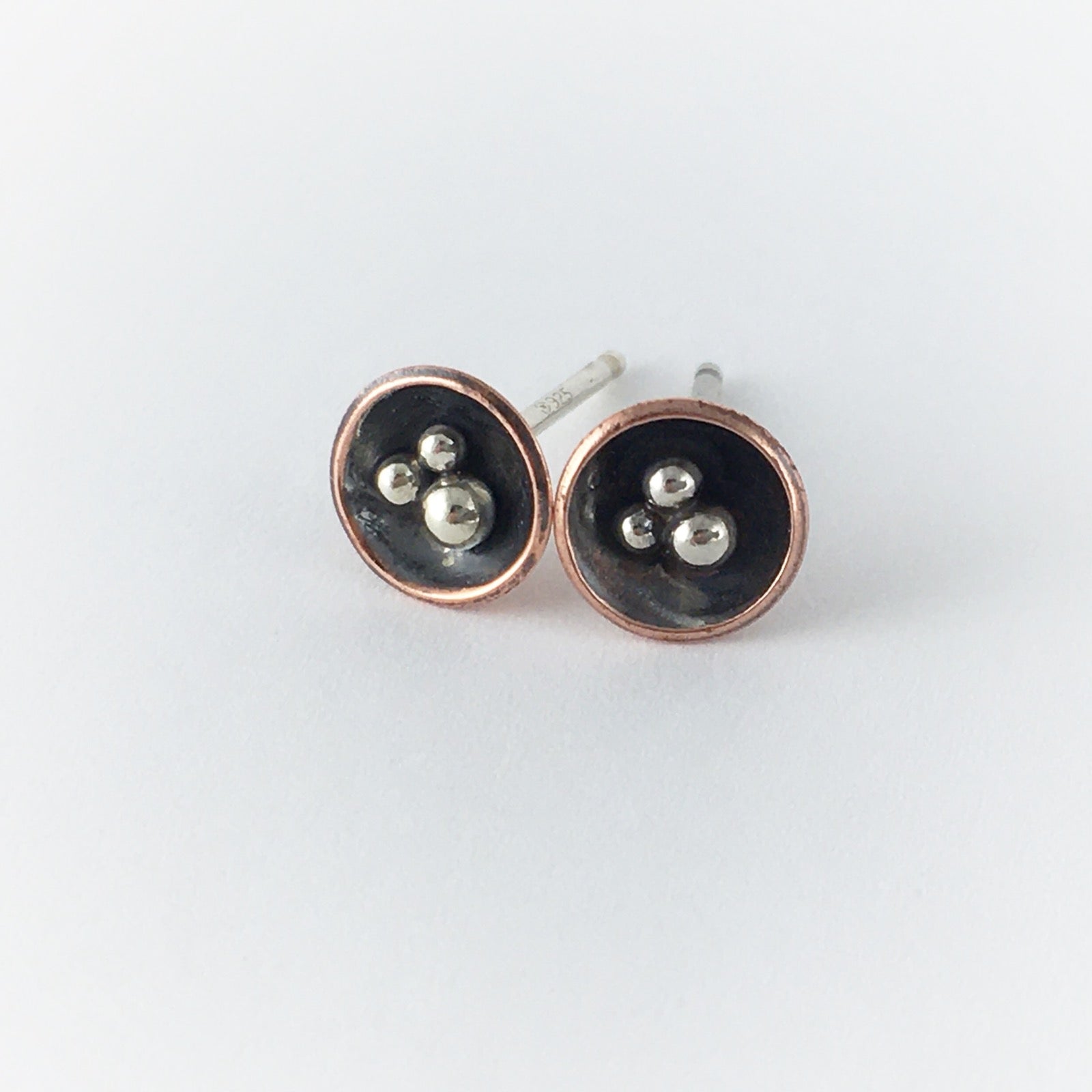 Nest stud earrings, inspired by my time spent in the woods around actual bird nests and bird nest fungi. Easily my favorite pair of studs we create and are a staple in my everyday rotation. These studs are hand fabricated in copper, domed and have sterling silver granulation in the cups. The cups are 3/8" wide and come off the ear about 1/8"