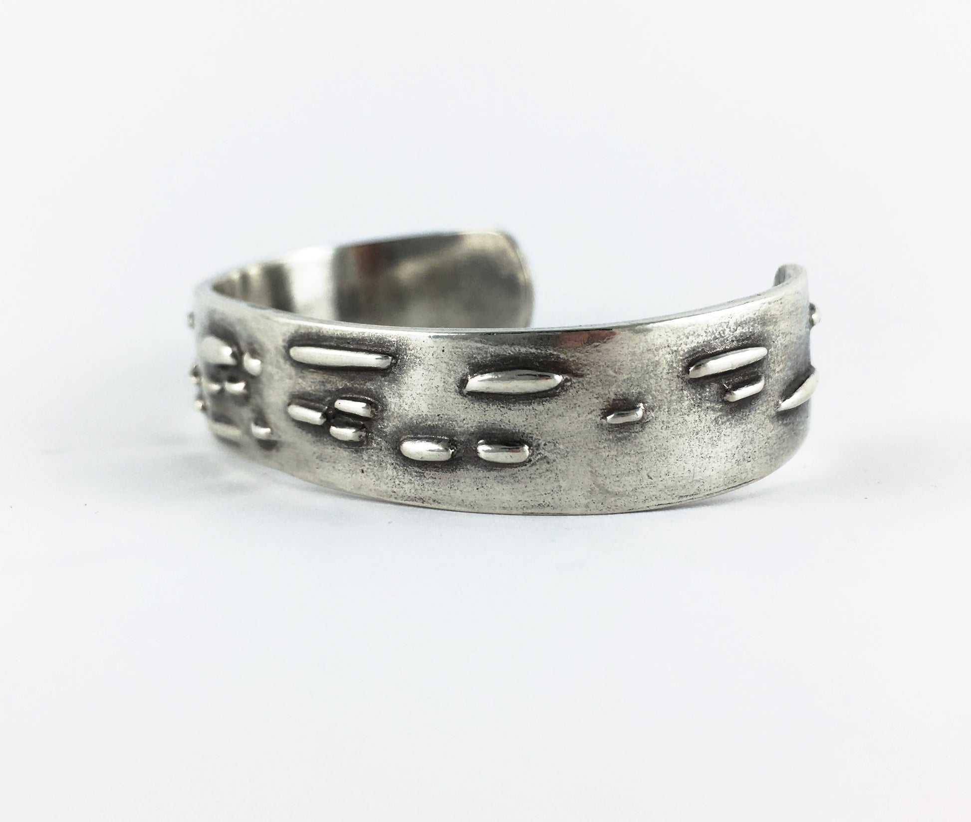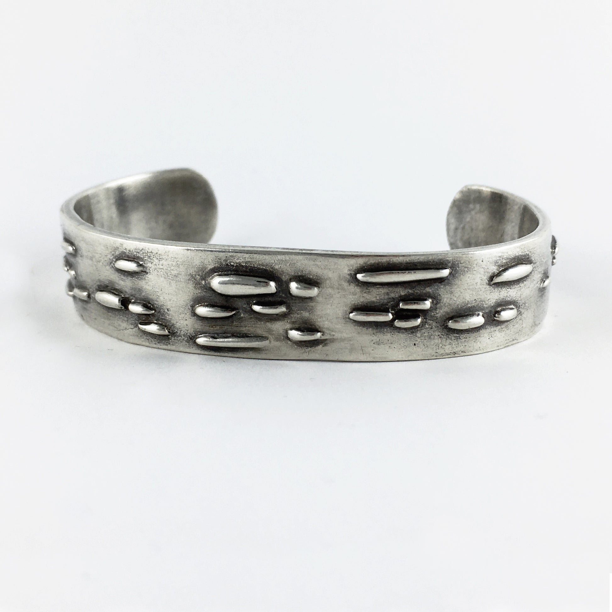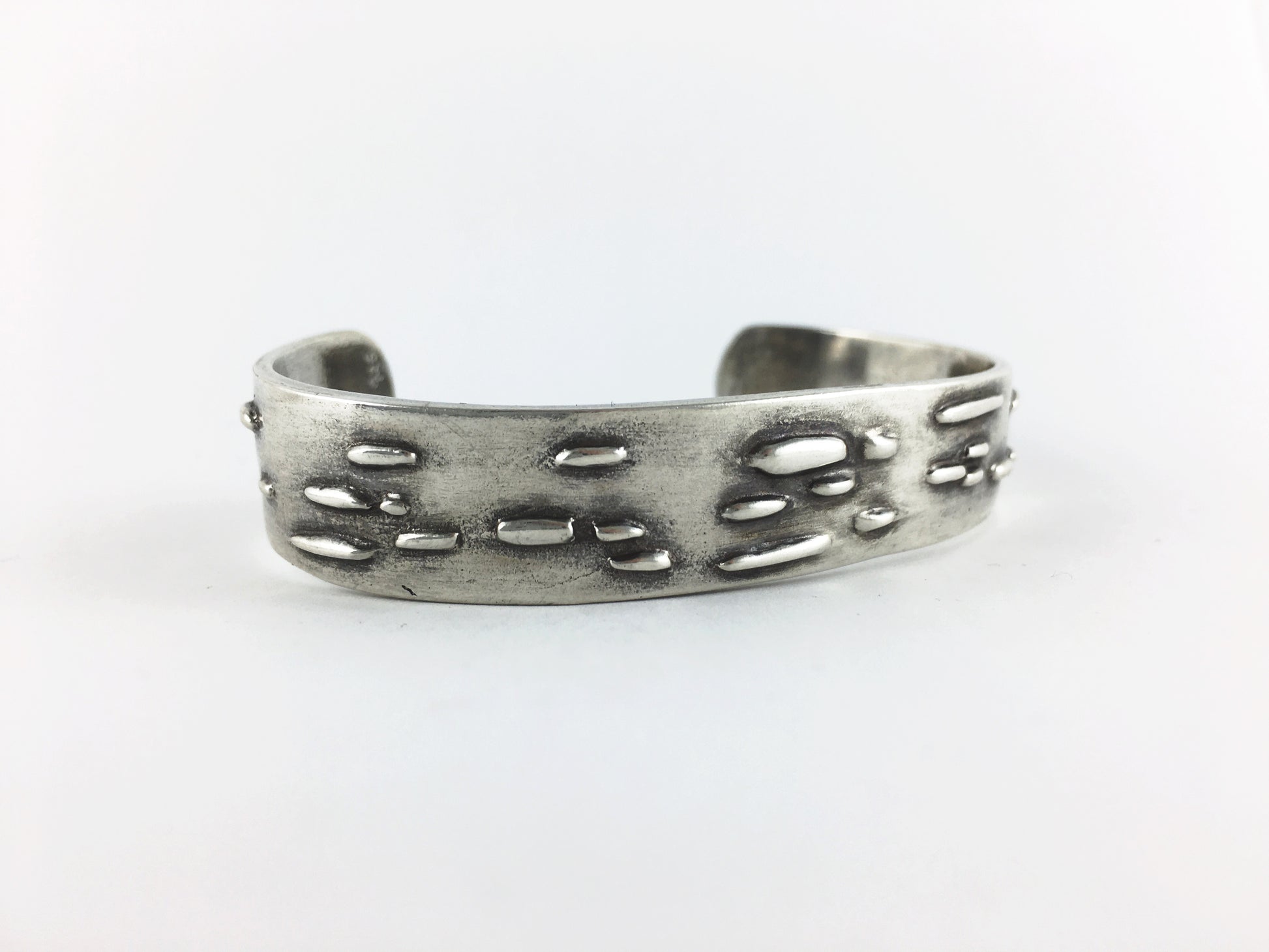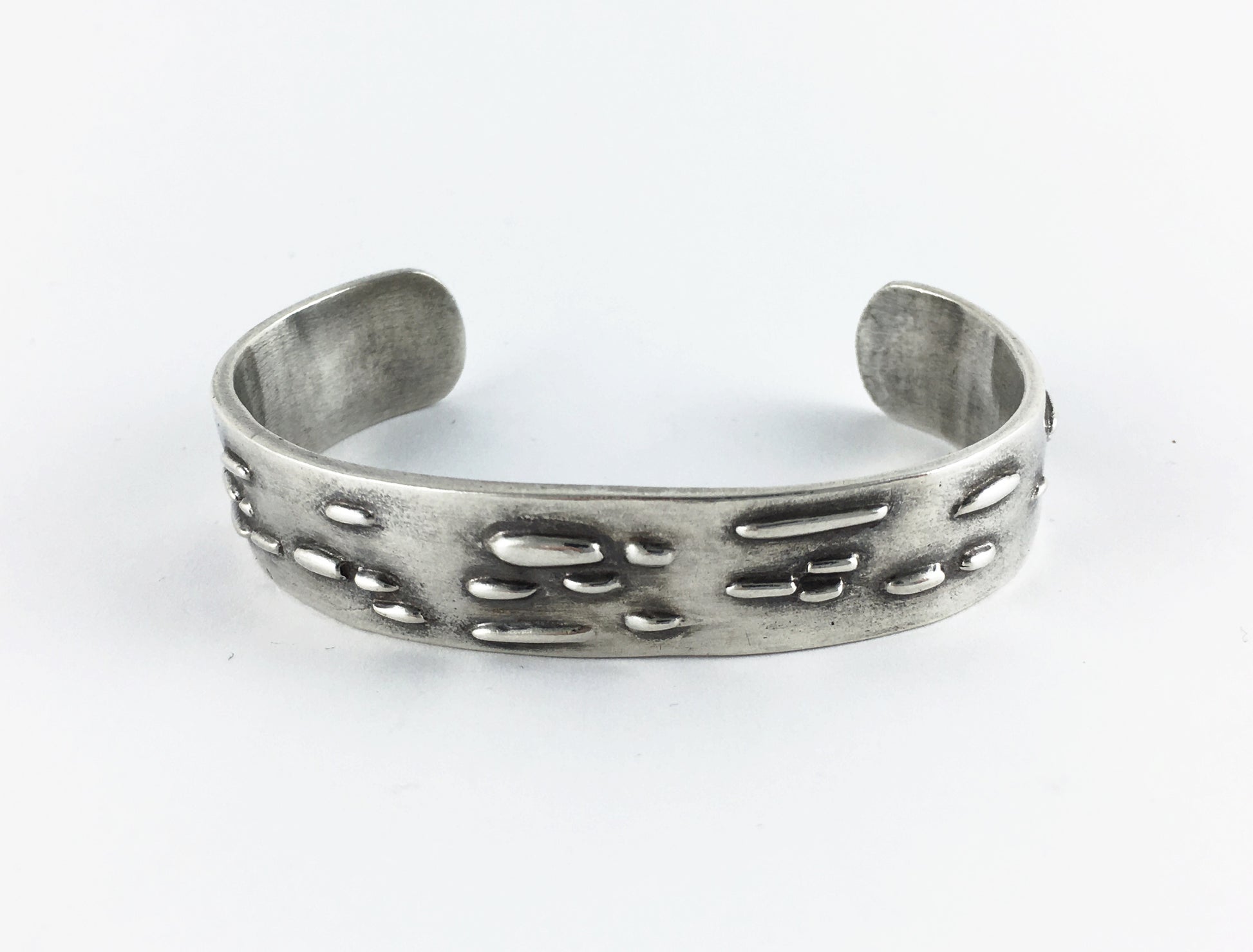 Hand textured and cast in Sterling Silver and oxidized to enhance the depth and detail. This cuff is substantial enough for larger wrists, and also looks great on a more delicate arm.