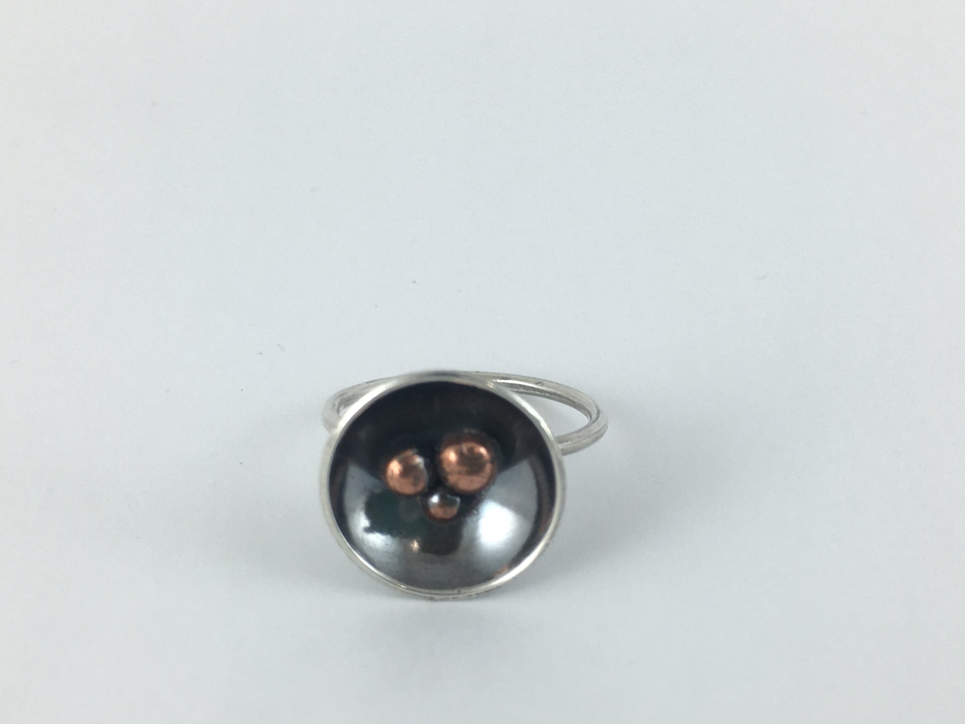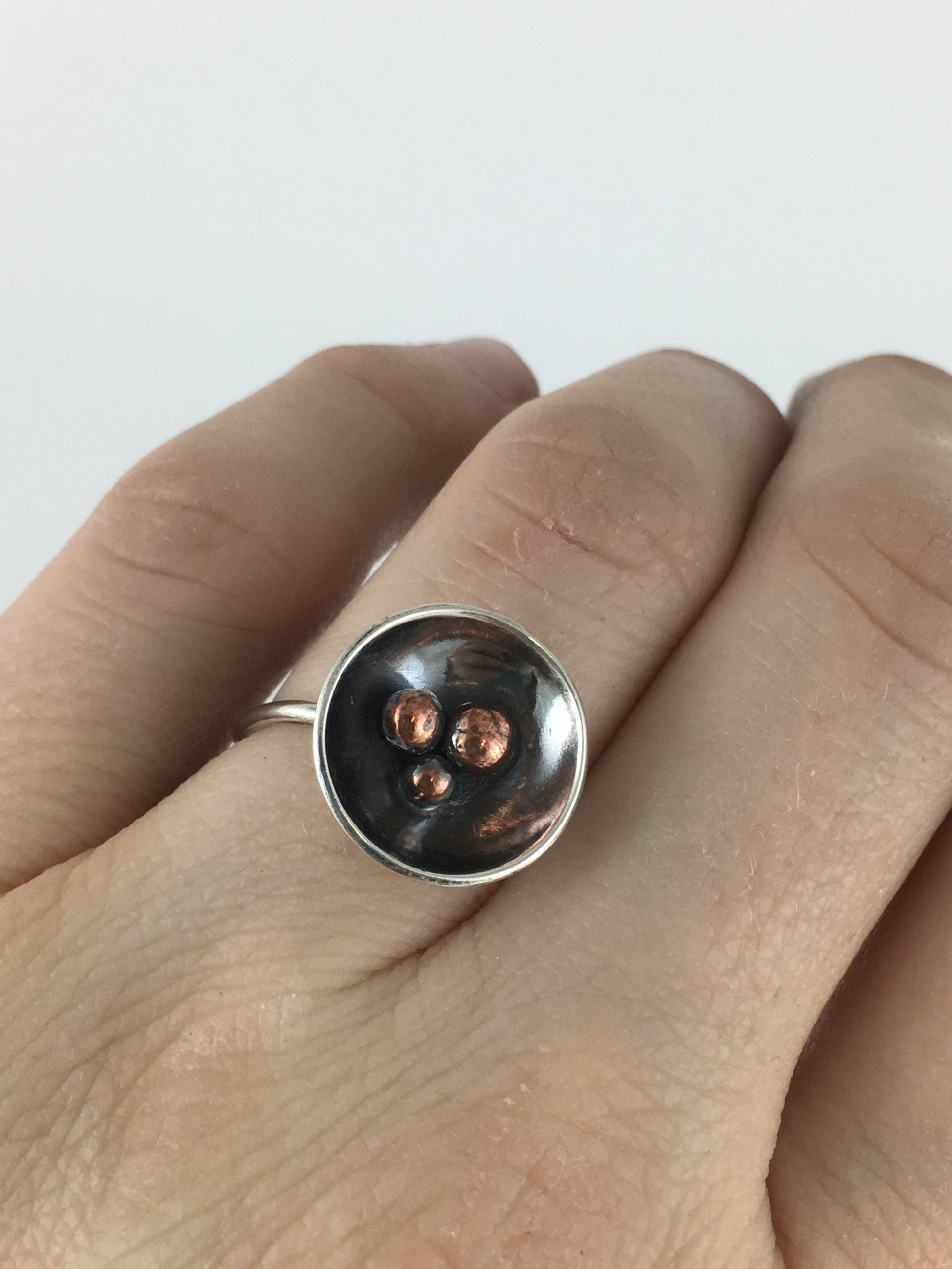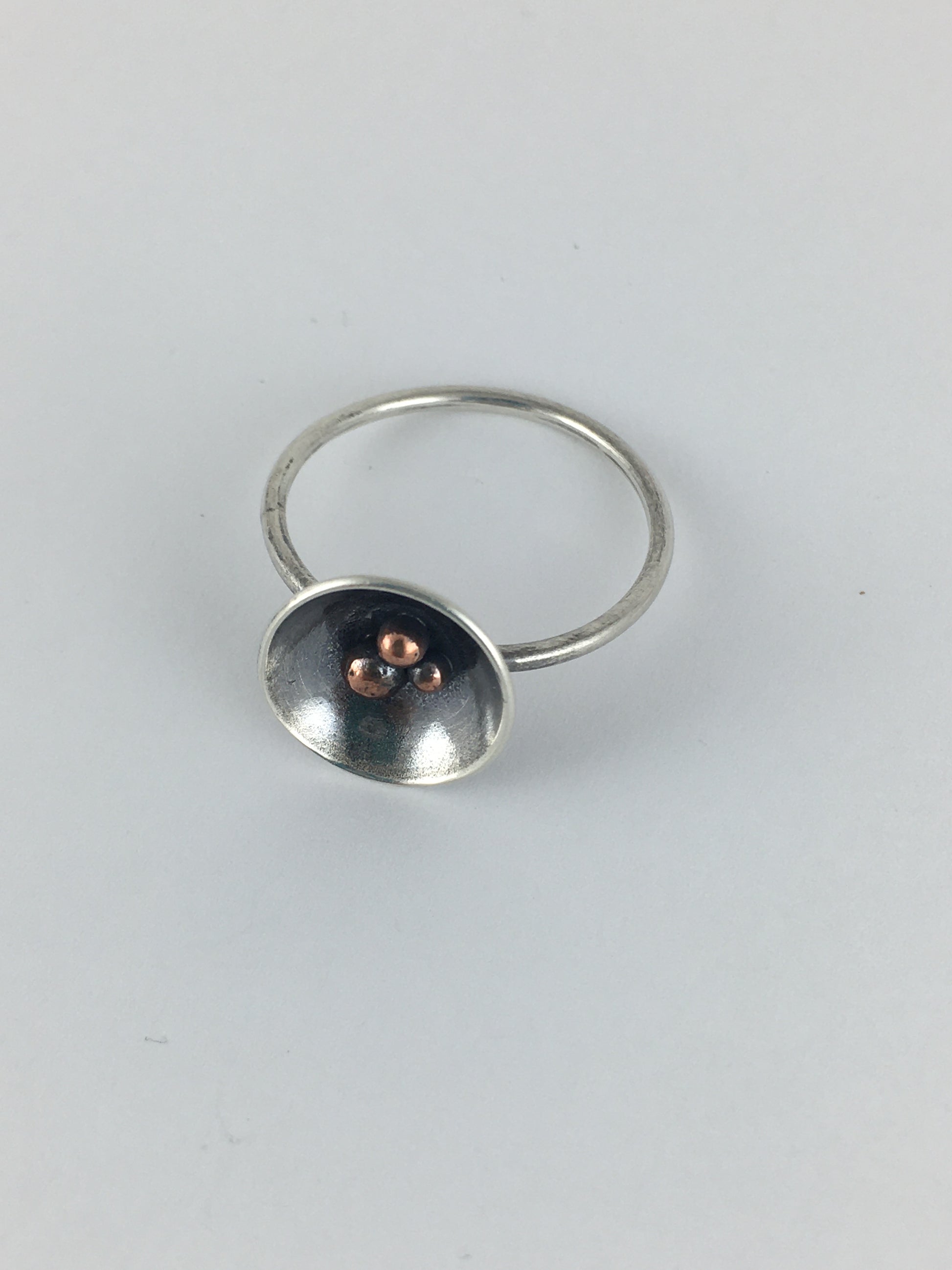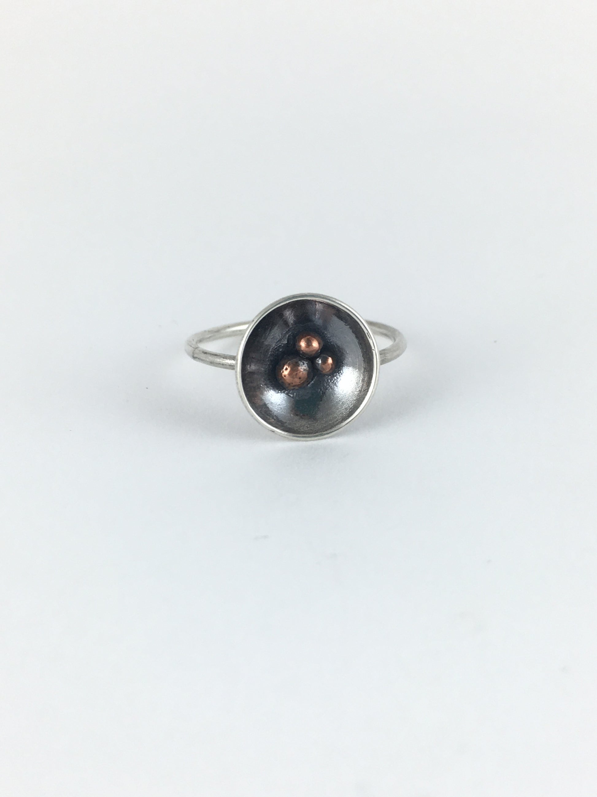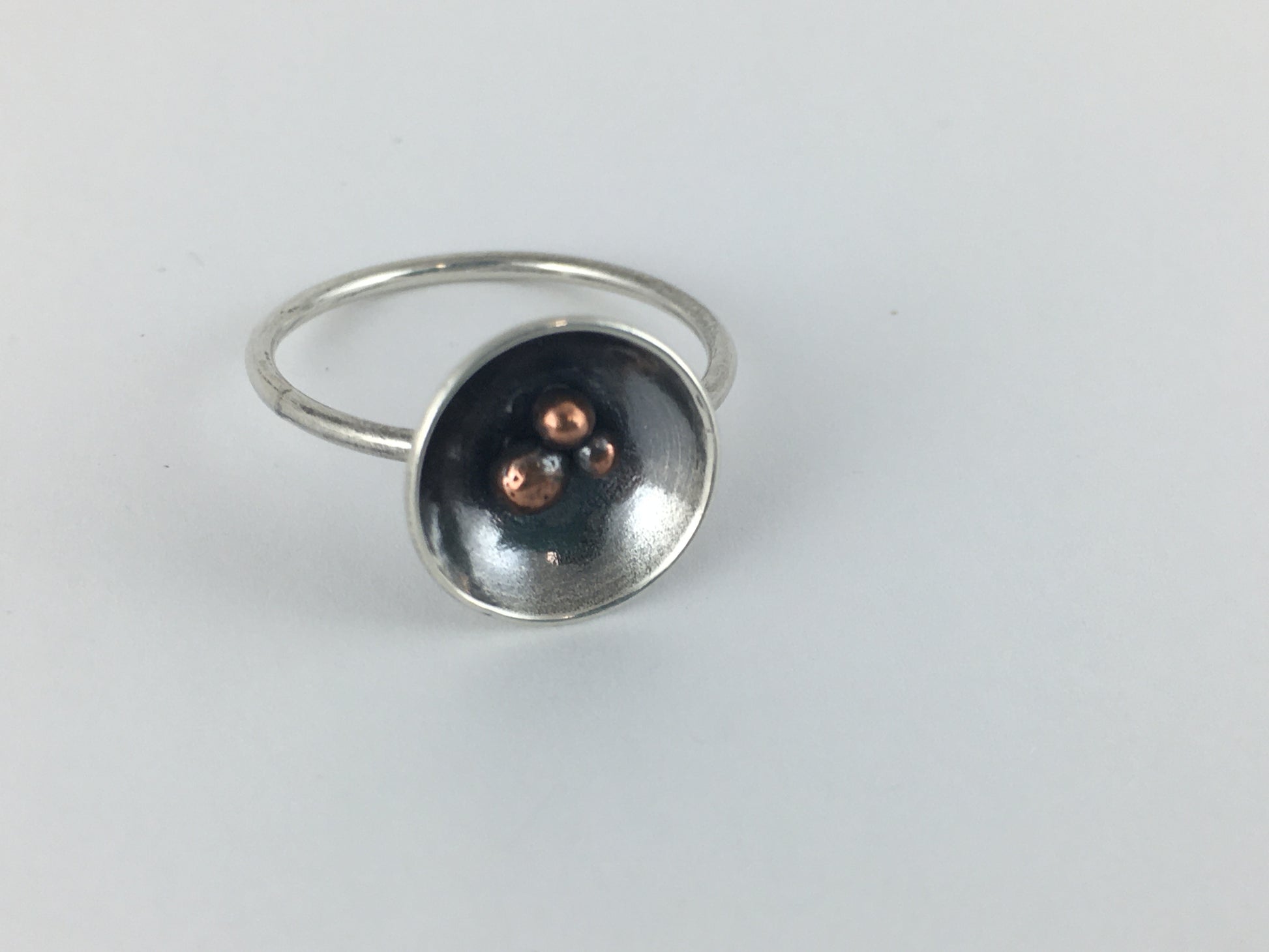 The band is sterling silver with a hand hammered sterling silver bowl holding a cluster of sweet little copper spheres which, like eggs in a nest, are unique for every ring. The silver nest measures about 7/16" in diameter and stands off the band just under 1/4".