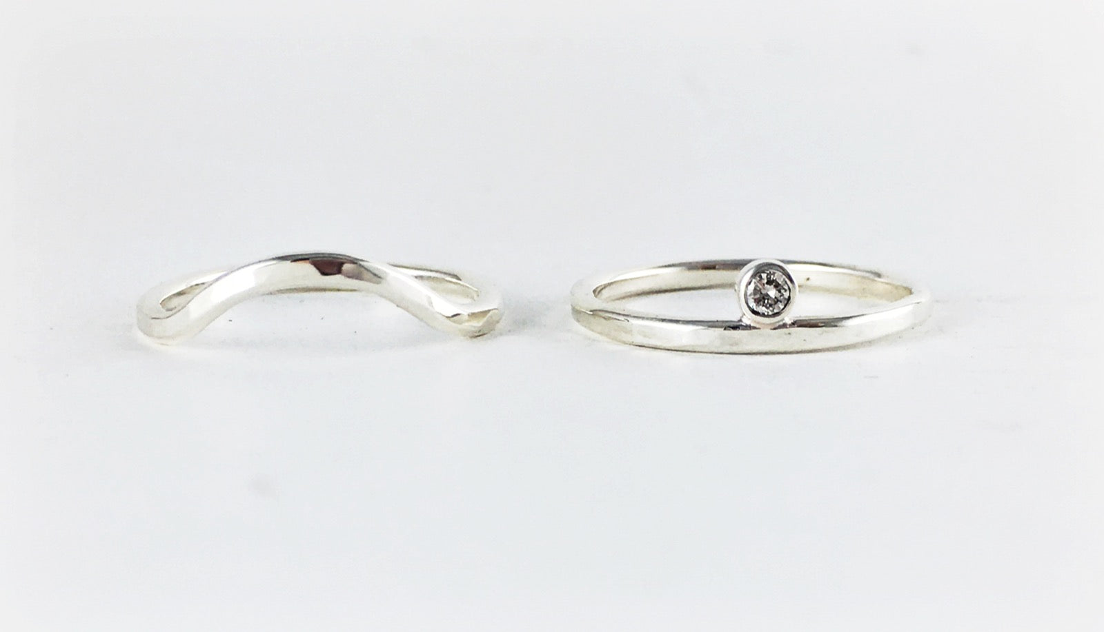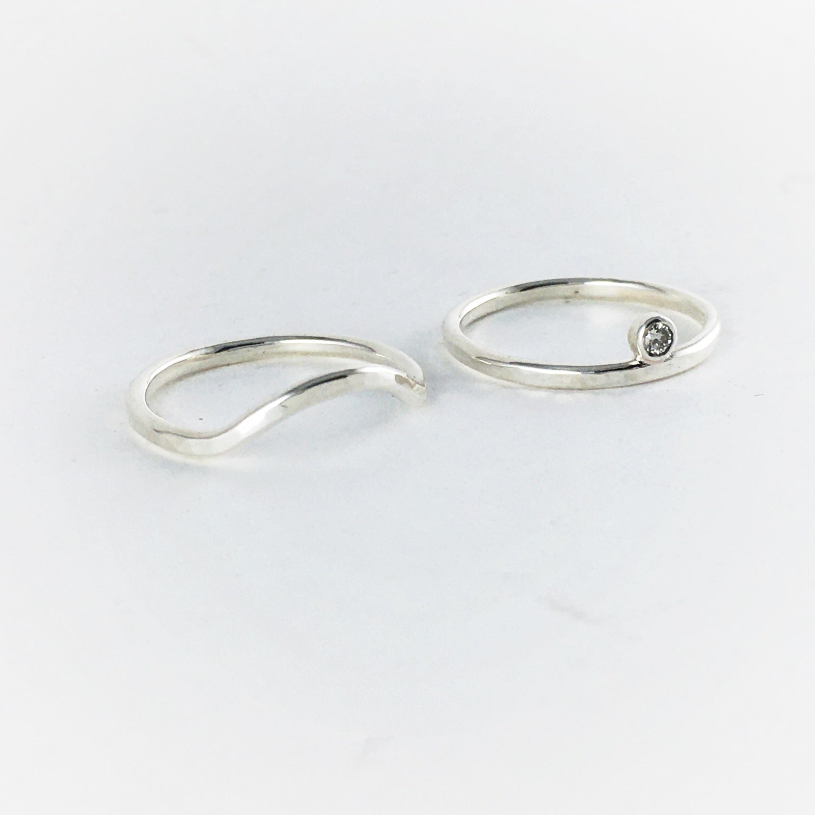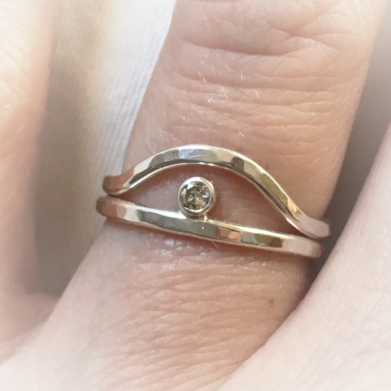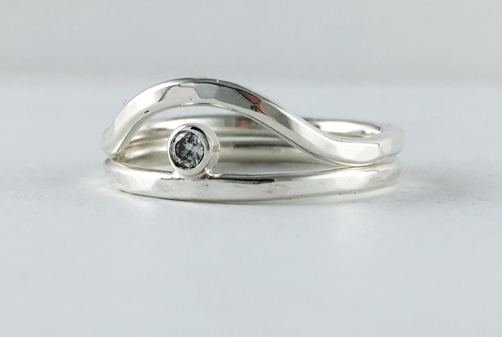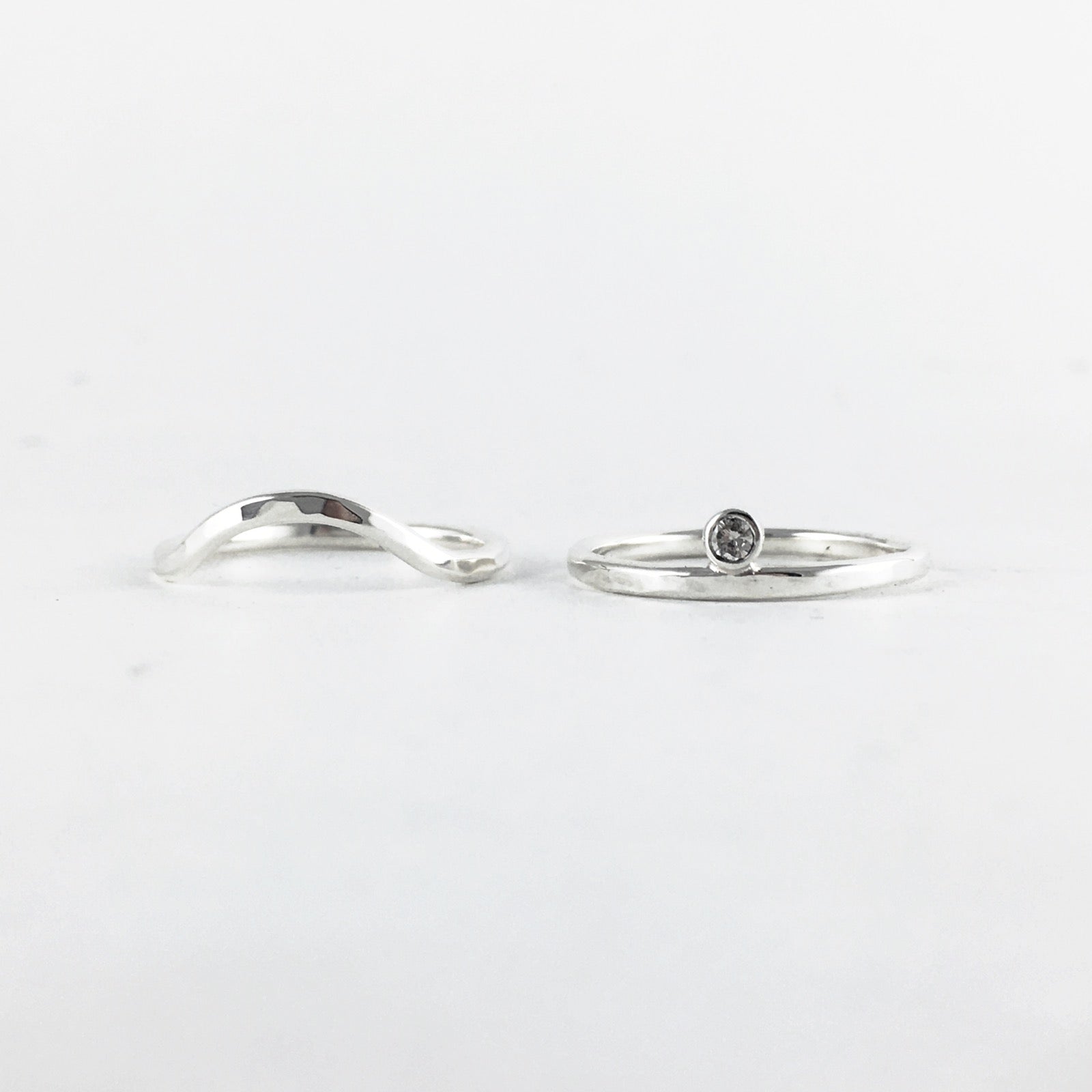 These slender stacking rings radiate a simple elegance. The water-like hammer texture of the bands provides a nature inspired backdrop for a 2.5mm ethically sourced, salt and pepper diamond. The curved band arcs above the stone, creating a space that frames its brilliance, like clouds above a rising sun.